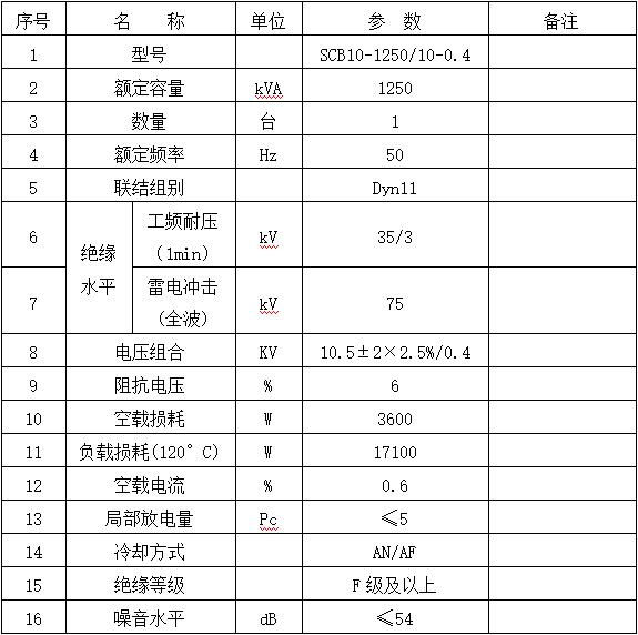1250kVA干式變壓器的技術(shù)協(xié)議內(nèi)容要求