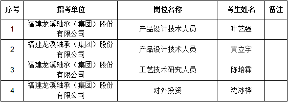 根據《福建龍溪軸承(集團)股份有限公司2022年公開招聘方案》有關規定,經面試等程序,現將公司擬聘用人員予以公示,公示期為5個工作日,公示名單如下: