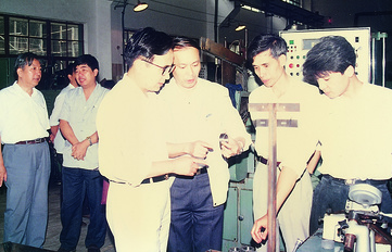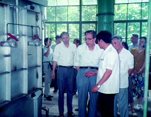 1990年4 月16日,唐仲文(時任機(jī)電部副部長,左三)及福建省機(jī)械工業(yè)廳領(lǐng)導(dǎo)視察龍軸