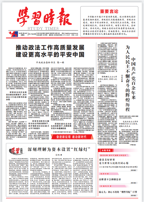 3月16日,學(xué)習(xí)時(shí)報(bào)頭版頭條刊發(fā)中央政法委秘書長陳一新關(guān)于推動(dòng)政法工作高質(zhì)量發(fā)展建設(shè)更高水平的平安中國的署名文章,從探索政法機(jī)關(guān)加強(qiáng)政治建設(shè)的新路子、探索有效防范化解政治安全風(fēng)險(xiǎn)的新路子、探索改善社會(huì)治安生態(tài)的新路子、探索加快社會(huì)治理現(xiàn)代化的新路子、探索完善中國特色社會(huì)主義政法制度體系的新路子、探索政法服務(wù)黨和國家工作大局的新路子、探索打贏政法領(lǐng)域意識(shí)形態(tài)斗爭主動(dòng)仗的新路子、探索推進(jìn)政法戰(zhàn)線自我革命的新路子等八個(gè)方面進(jìn)行了系統(tǒng)闡述。