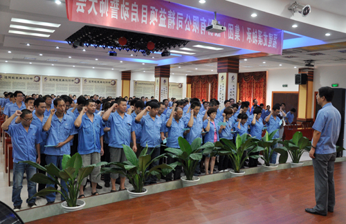 會上,陳晉輝常務副總首先宣布了《關于啟動精益項目管理的通知》,對項目范圍、目標、組織架構、項目小組人員和參與精益推進的相關各部門人員的職責做出明確規定,確保公司精益項目實施工作能夠按《精益項目計劃書(一期)》計劃內容順利進行,在2014上半年實現系統提績達標。企管部施毅群部長隨即就精益項目主體實施計劃與推進管理考核制度要點做了簡要講解。車間主管張高德、班組長張步斌分別代表公司中層主管和班組長發言,并帶領大家向公司董事長曾凡沛進行莊嚴的集體宣誓。協力中興董事長邱模榮也代表咨詢公司在會上發表了服務承諾。會議過程緊湊、氣氛莊嚴而又熱烈。